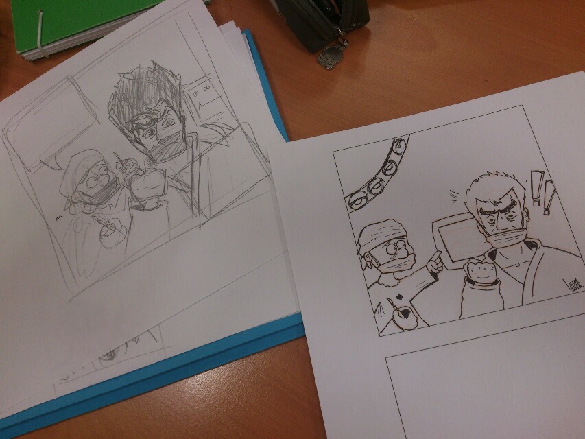 Luego el resto es más maquinal, cuando ya sabes qué tienes que dibujar lo que hago es imprimir en folios 2 viñetas grandes para tener margen para dibujar cómodo.