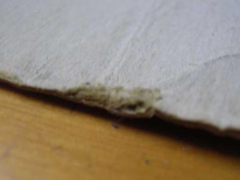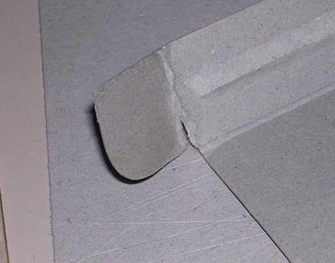 En otros casos: Podremos proceder el mismo modo, pero estas zonas, que han de doblarse son mucho mas peliagudas, y suelen resquebrajarse en el primer doblado después de "repararlas". Otra solución es la de aplicar parches, usando cartón del mismo tipo. Esta solución refuerza la zona, pero es complicado que quede bien.