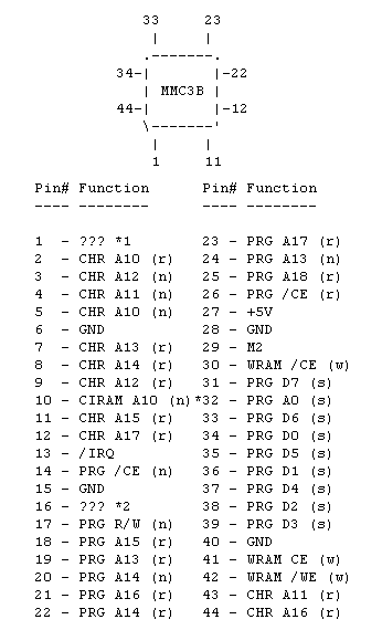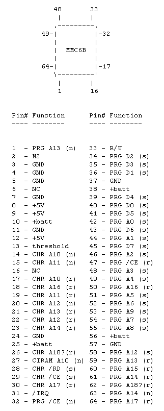 - *2: Hay veces que el pin 16 va conectado a masa y otras en las que simplemente esta "al aire". Parece ser que los pins 1,2 y 16 están relacionados entre si; si el 1 y el 2 están cortocircuitados entonces el 15 y 16 también lo estarán. Si los pines 1 y 2 están sin conectar, también lo estarán el 15 y el 16. Nunca he visto, por ejemplo, que los pines 1 y 2 estuviesen conectados entre si, mientras que el pin 16 estaba desconectado o viceversa. Sospecho que están relacionados con la RAM extra de la sección de la CHR.